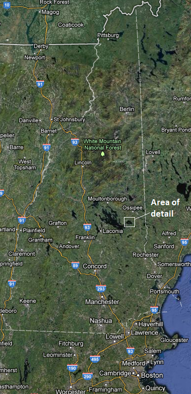 The view to the south is dominated by Copplecrown Mountain (seen in the header image of this site). To the north, Mount Shaw in the Ossipee Mountains ring dike and Mount Chocorua, in the foothills of the White Mountains, dominate the scenery. On a very clear day, it is said that Mount Washington is visible. To the east, a series of low hills corral the lake.